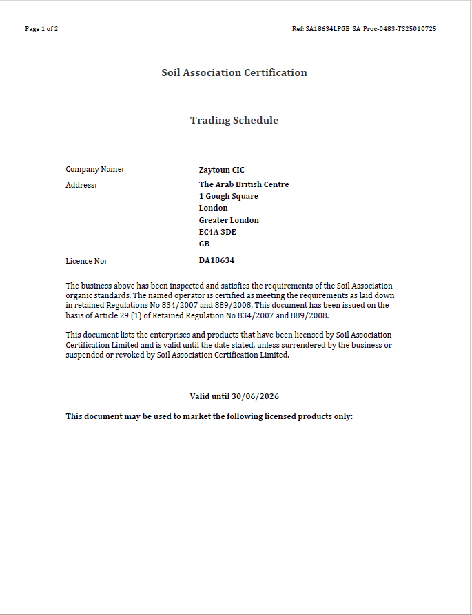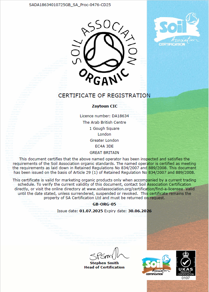 Zaytoun is a registered Community Interest Company and 100% of our profits are reinvested back into the business. All our products are fairly traded and where possible they are certified organic. Below you’ll find our certificates of registration and if you have any queries please drop us a line.