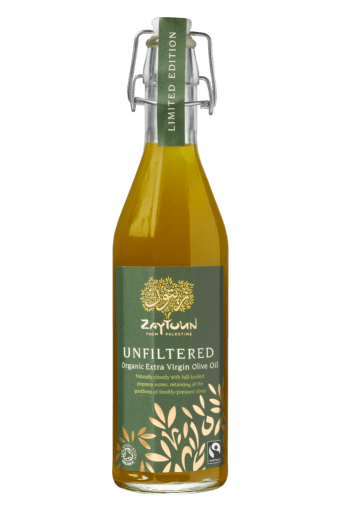 For the first time ever, we bring you Palestinian unfiltered olive oil straight from the recent olive harvest. This organic, cold-pressed oil retains a light olive pulp, a product of the natural olive milling process. This gives it a characteristic cloudiness.